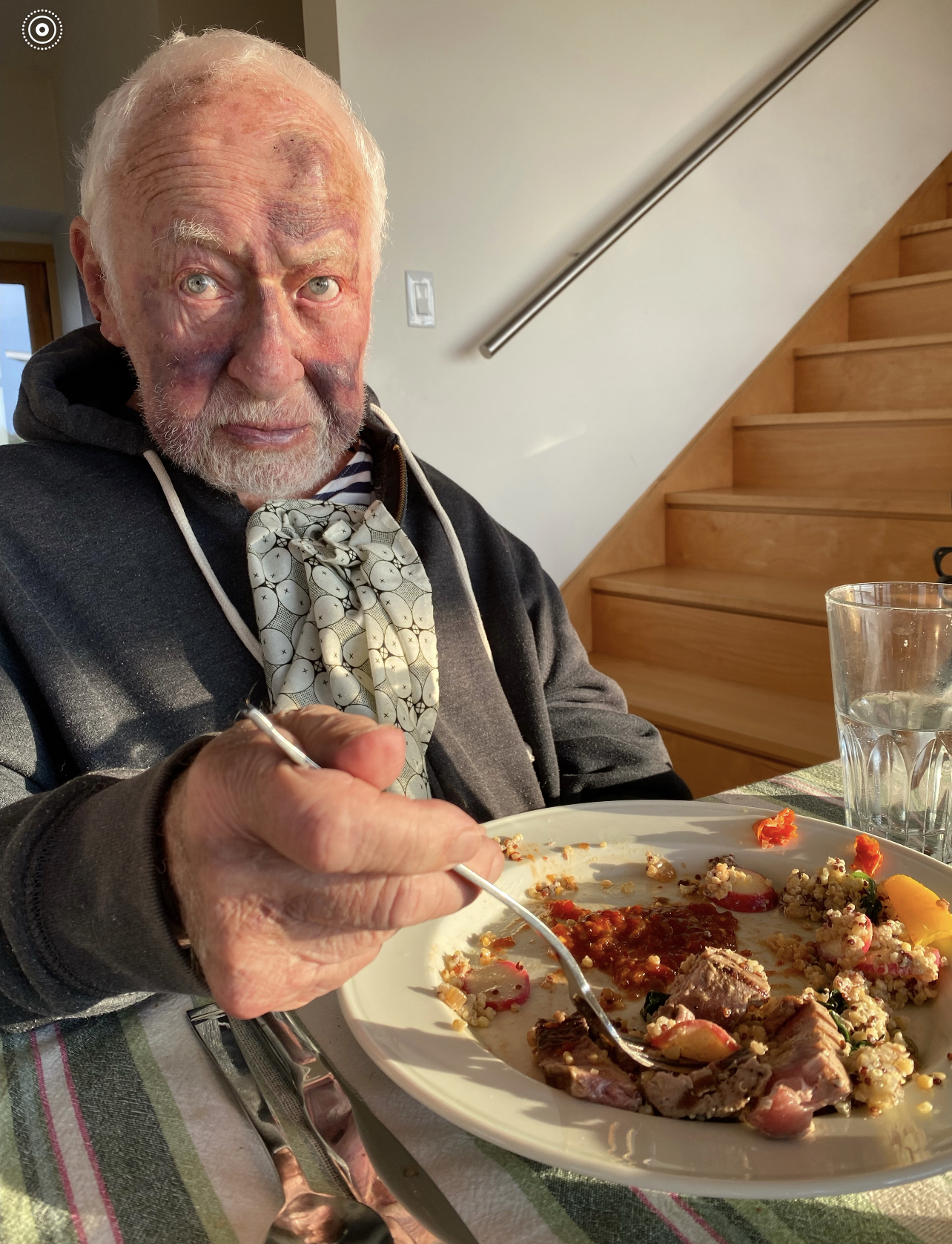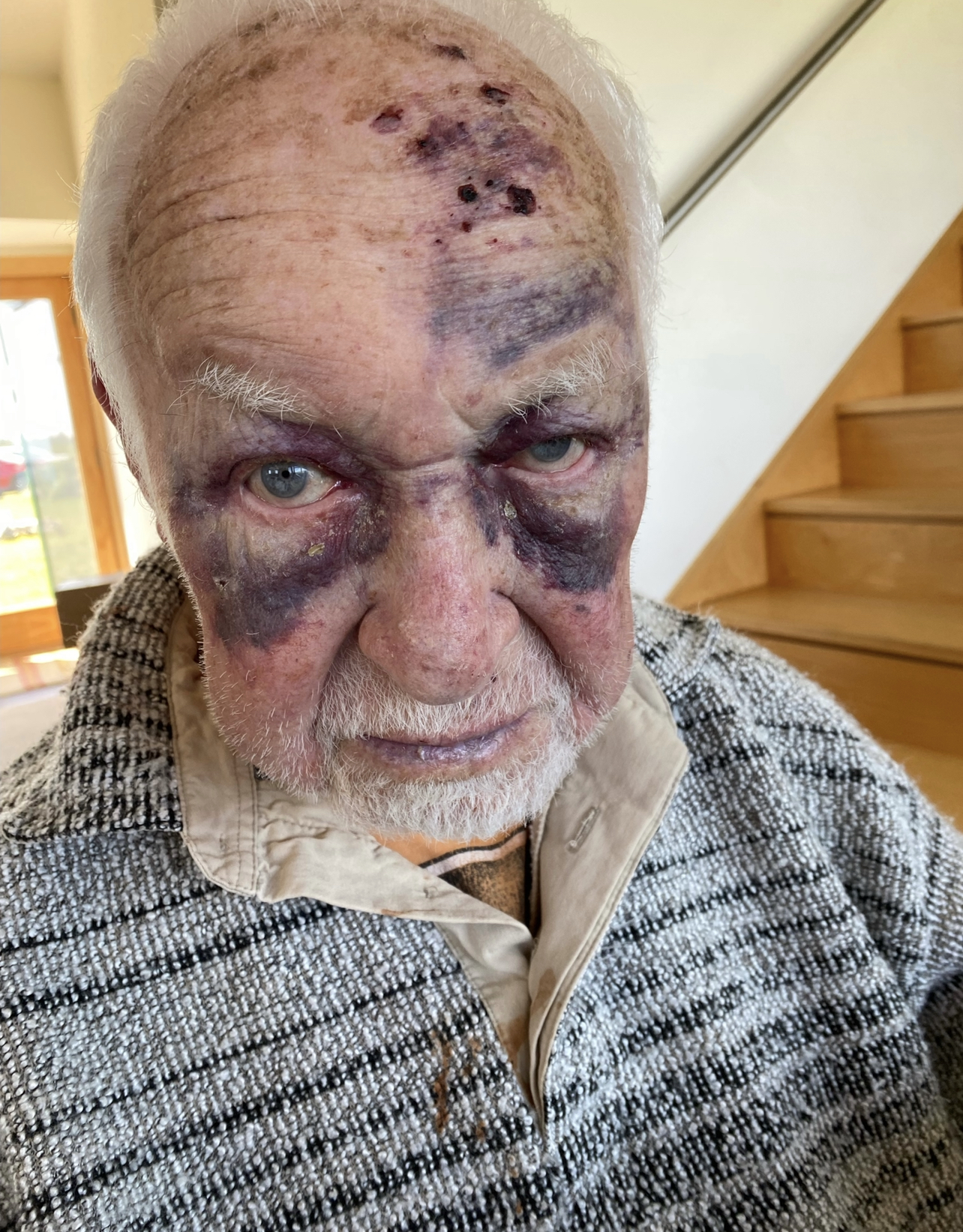 YOU SHUDDA SEEN THE OTHER GUY!!!! Just kidding. HG looks like HG has been in a ferocious fist fight, N0thing so dramatic.HG just slipped getting out of bed–tumbled. Not serious. BSK to the rescue.. Black eyes. Lump on forehead (it’s gone). Feeling fine, don’t worry!