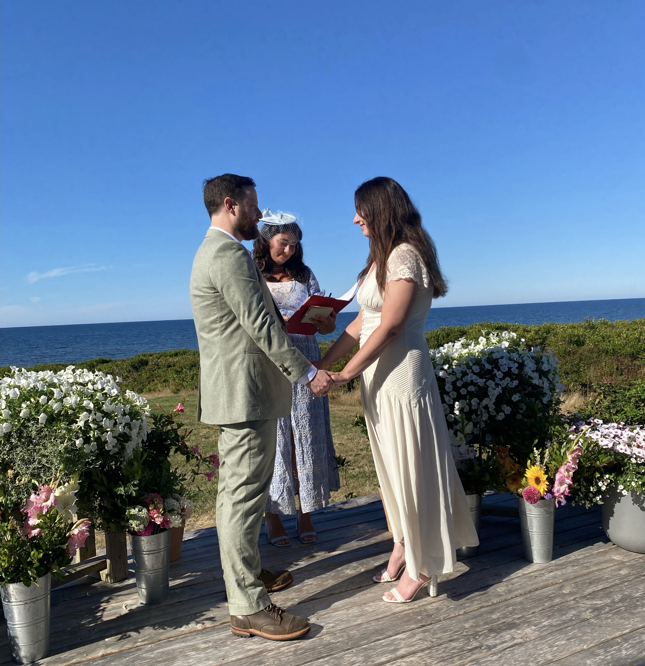 Everyone agreed. The wedding of Arianna R. and Adam L. was the best wedding day ever–surpassed anything in recalled history. The site was the family oceanfront home on Prince Edward Island. The actual ceremony was at 4.00 PM, Aug.28, but the joyous time began at breakfast and continued through a bright and sunny day (augurs well for the marriage) and ended late at night. The couple exchanged their vows on the deck facing the sea–the deck was festive with flowers and flower planters–the dogs, Pip and Toby, wore flowers. VIgorous beach walks (alas, HG daughter and Victoria had to leave PEI and attend to their culinary enterprises). BSK and daughter Lesley R. prepared a tasty late lunch. Showers and formal (relative to PEI) dressing. All were seated–many photos and glasses of champagne. Noel and Yossi arrived to share in the joy (Noel is BSK’s sister, Yossi is Noel’s husband and BSK’s brother-in- law). Sofia organized and choreographed the wedding ceremonies with style, creativity and eloquence (she was ordained a Universal Life Church minister in order to officiate). Before the vows that made the marriage official, there were remarks and toasts from HG/BSK (Ari’s Grandparents) and Lesley and Massimo R. (Ari’s parents). Sofia closed with a shatteringly beautiful burst of speech and poetry–a tribute to the couple and wishes for marital happiness. A professional photographer arrived and photographed the champagne swilling family–and steered the official husband and wife to the beach for numerous photos of the two of them. Happy and hungry, the group was off to the Wheelhouse Restaurant for music and fabulous food –the restaurant is in Georgetown with exceptional river views. Before the meal, Yossi (and his guitar) entertained with the same Yemenite love song he performed for Lesley and Massimo’s wedding decades previous. The wedding feast comprised the best and most inventive food HG/BSK ever ate on PEI. Here’s the menu: Fresh shucked oysters– Shipwreck from South Lake and Tuxedo from Cascumpec Bay (briny and delicious); Potato brioche with honey butter and blueberry jam (incredible combination—the potato brioche was so flavorful that two loaves were brought back home for breakfast); scallop ceviche and and halibut salad (served with focaccia); sauerkraut croquettes (these were shaped into balls and were one of the best things HG ever ate (and that includes yummy things HG ate in New York, Paris, London, San Francisco, New Orleans). Final main dish was lobster paella with Greek salad, aioli potatoes and sumac pickles (generous amount of lobster meat). Dessert was fried, honey churros and blueberry ice cream, (churros were a flight into heaven). At the end of this splendiferous wedding day feast, the wed couple cut a slice of their wedding cake (brought from home). More toasts at the end of the wondrous wedding day.