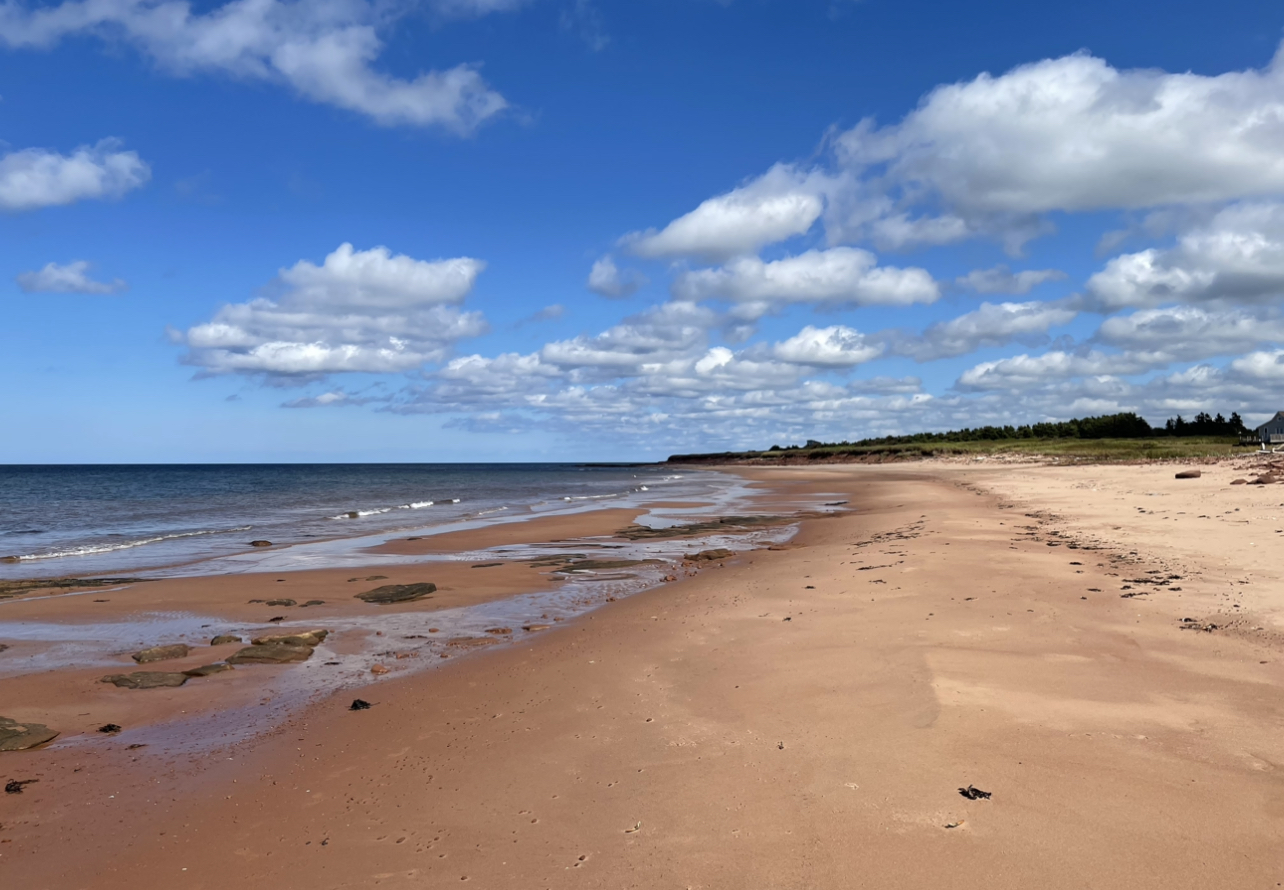 After some chilly weather, Prince Edward Island warmed up comfortably—and there’s abundant sunshine. HG is cozy in the Freeman/Riva oceanfront family home on the north shore. Son Jeremy (aided by Profesore Massimo R.) cleaned the panoramic expanse of windows so the sea views are exhilarating. BSK and the Rhode Island and Tokyo clans are enjoying the HG/BSK private beach. Supper two nights ago was based on quahogs (cherrystones) harvested by Freemans and Rivas from a south shore bay. Linguine with white clam sauce was a yummy dinner (using super fresh clams plucked from salt water homes made a positive difference). Last night, Gifted daughter Lesley R. took over the kitchen. A supper feature was a big platter of tiny boiled potatoes smothered in olive oil and a mountain of dill and other herbs. Yes, PEI potatoes are unique– have a tingling mineral taste because they are cultivated in sea salt enriched red earth. (That’s HG’s presumption). The meal continued with a sheet pan of haddock filets and ripe cherry tomatoes. Finale was a green salad and a selectôn of cheeses. A joyous supper.